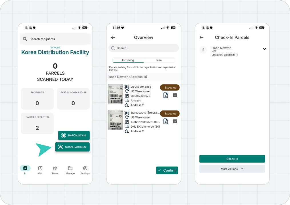 Shipments will now appear under Checked In and can be viewed through the Manage tab or the Parcels tab on the dashboard.